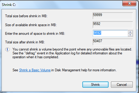 Enter the amount of space to shrink ii MB में आपको ये लिखना होगा की आप कितना GB का Hard Disk बनाना चाहते है | मान लो आप 100 GB का एक Drive बनाना चाहते है तो आपको इसे 1024 से गुना करना होगा यानि की 100 *1024 =102400 MB यानि की आपको GB को Convert करके MB में लिखना होगा |