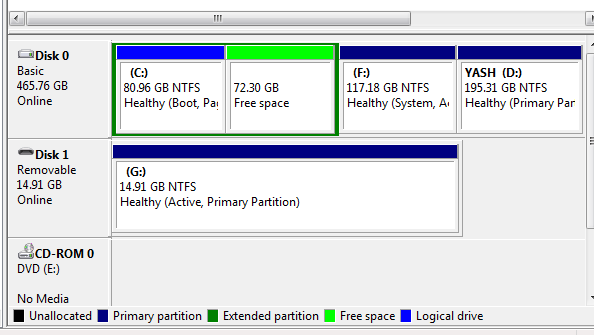 यहाँ हरा रंग का एक Drive दिख रहा है हमने जो नए ड्राइव Partition किये वो यही है इसका नहीं निशानी है |