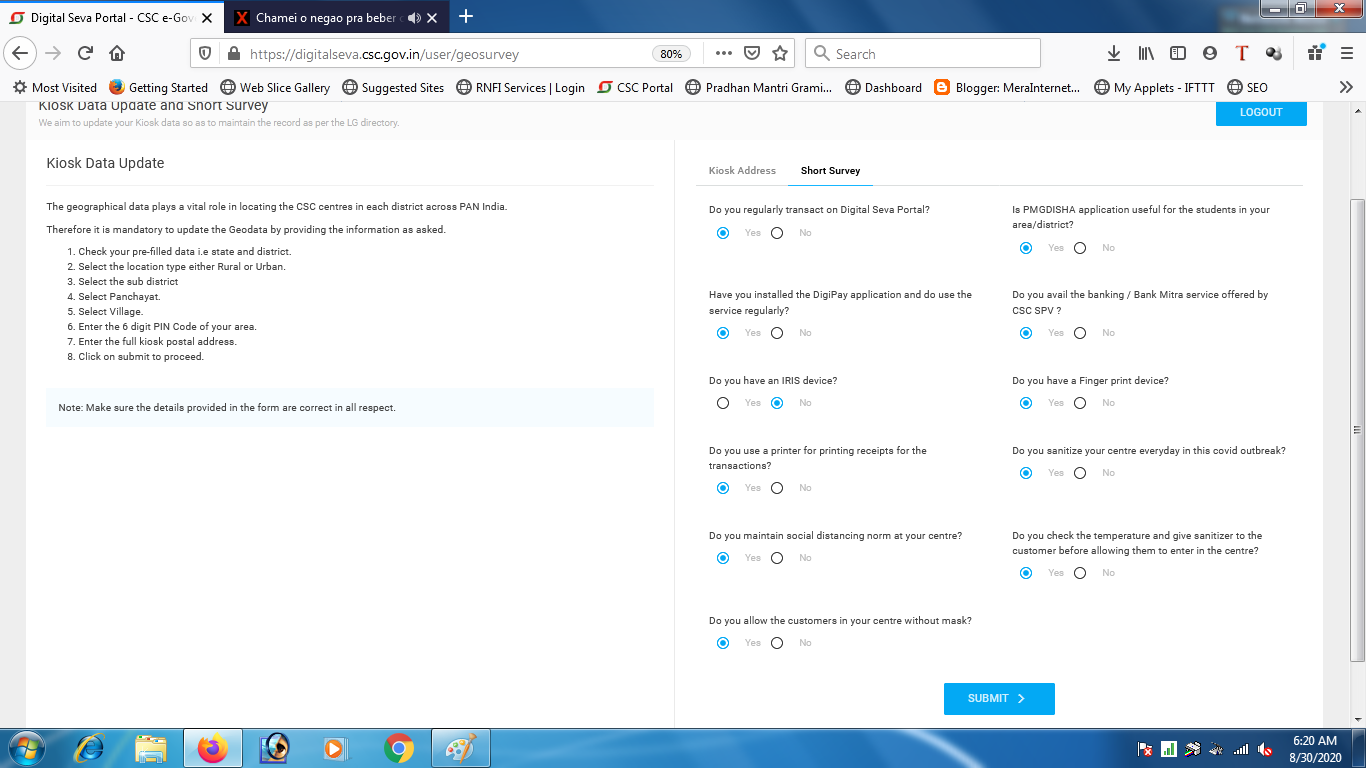 Dosto Yaha Pe Aapko Center Ke kya kya Service Hai Uske Baare Me Puchha Jayega. Aapke Pass Kya kya Device Hai Ye Bhi Puchha Jayega To Dosto Aap Ye sab Fill Karke Submit Button Par Click Kar De. Dosto Yadi Aapko CSC Se Related Kuch Bhi Sawal Karni Hai tO Aap Niche Comment Box Me Hame Comment Kar Sakte Hai. Dosto Is Post Ko Apne CSC bhaiyo Ki Share Jarur Kare. Sath Hi Dosto Yadi Aapne Hamare Facebook page Ko Like Nhi Kiye hai TO Jaldi Se Kar Le.
