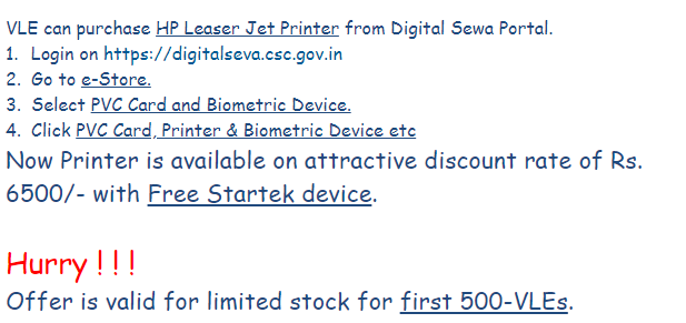 Dosto 26/11/2019 Ko Sabhi VLE Bhaiyo Ke Digimail Me Ek Offer Jarur Aaya Hoga Ki Sabhi VLE Ko HP Printer Buy Karne Kar Startek Device Free Diya Jayega. Dosto yadi aap Bhi Printer Buy Karne Ko Soch Rhe Hai TO Is Mauka Ka Fayda Jarur Uthaye.